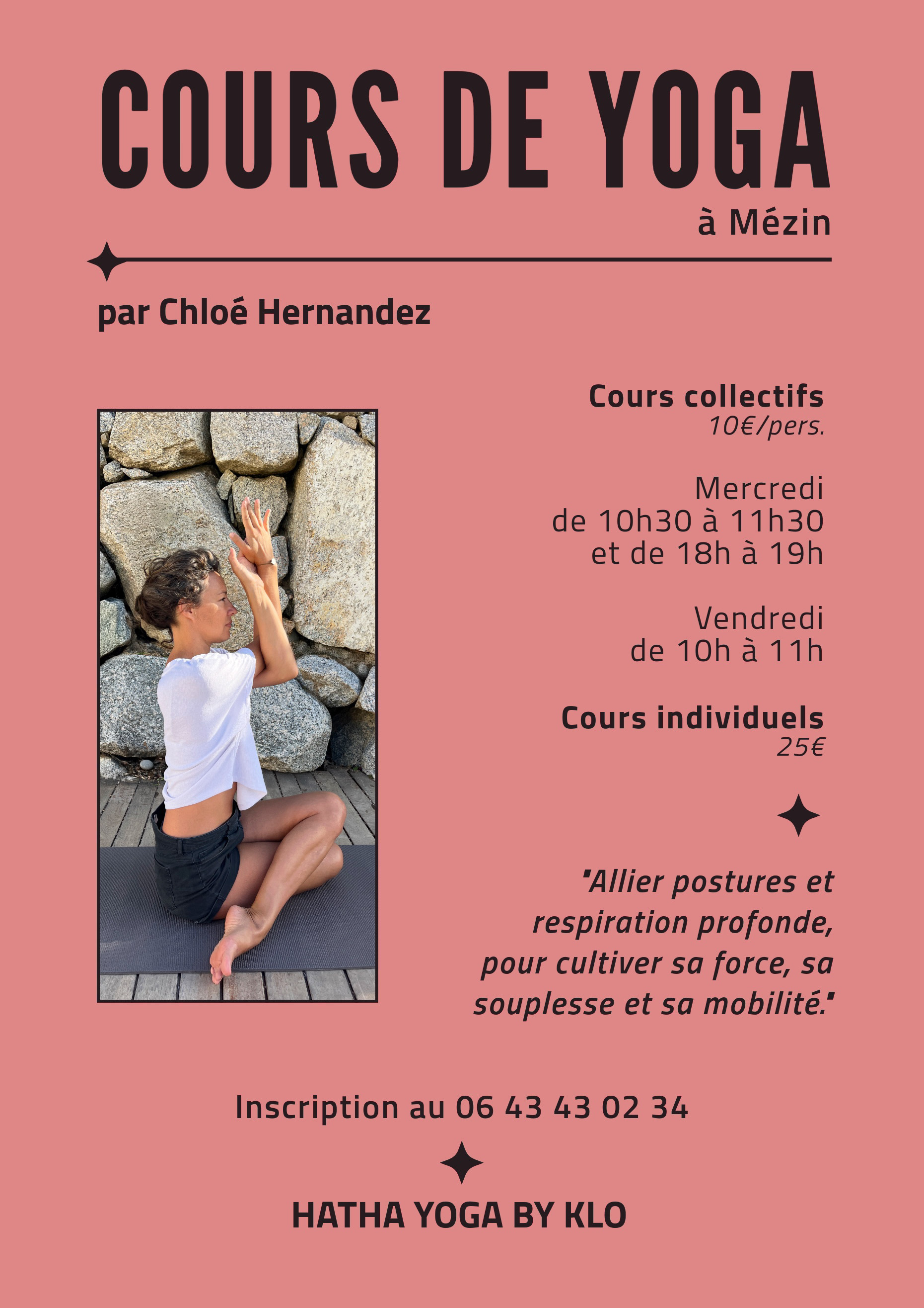 Chloé propose des cours de yoga chaque mercredi matin de 10h30 à 11h30 et de 18h à 19h, le vendredi de 10h à 11h. Des moments pour allier postures et respiration profonde, cultiver force, souplesse et mobilité.