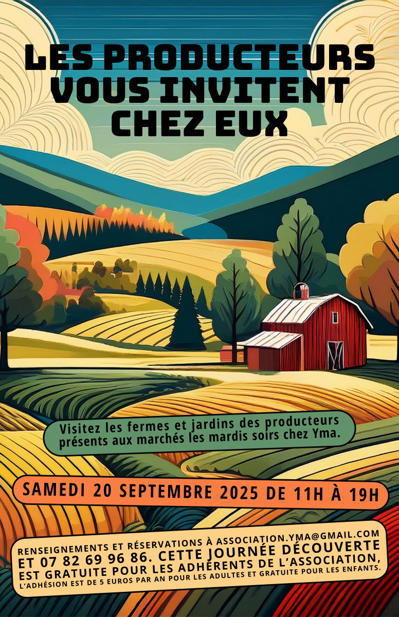 L’association Yma accueille tous les mardis soirs un marché de producteurs, nous y trouvons du pain, des légumes, du miel, des fruits, des jus de fruits et du fromage. Nous vous invitons à découvrir où et comment sont conçus ces produits en allant visiter les fermes et jardins des producteurs, qui seront vos guides lors de cette matinée.